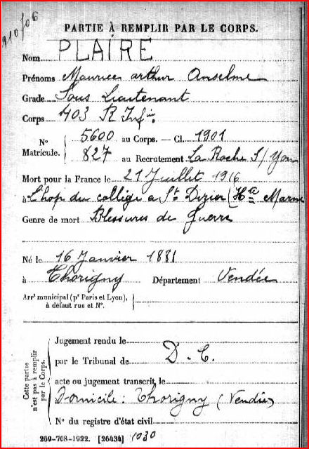 Maurice Arthur Anselme PLAIRE, né à Thorigny le 16.1.1881, était le fils de François Eugène PLAIRE (° 24.9.1851 Vouillé les Marais), instituteur communal à l'école publique de garçons de Thorigny de 1875 à 1907, et de Léontine Adéline BLAINEAU (° 6.2.1854 Thorigny) qui s'étaient mariés à Thorigny le 11.9.1877.